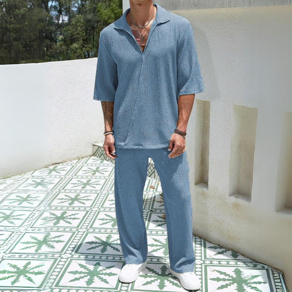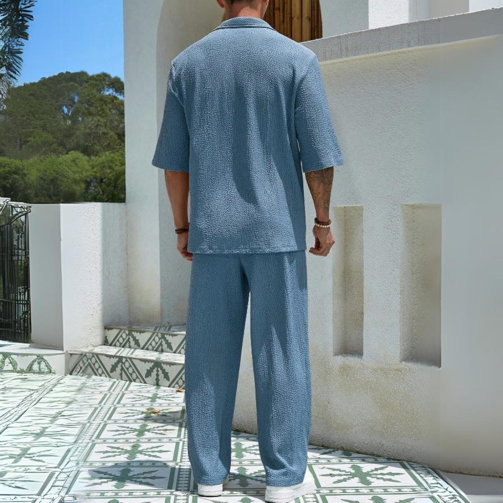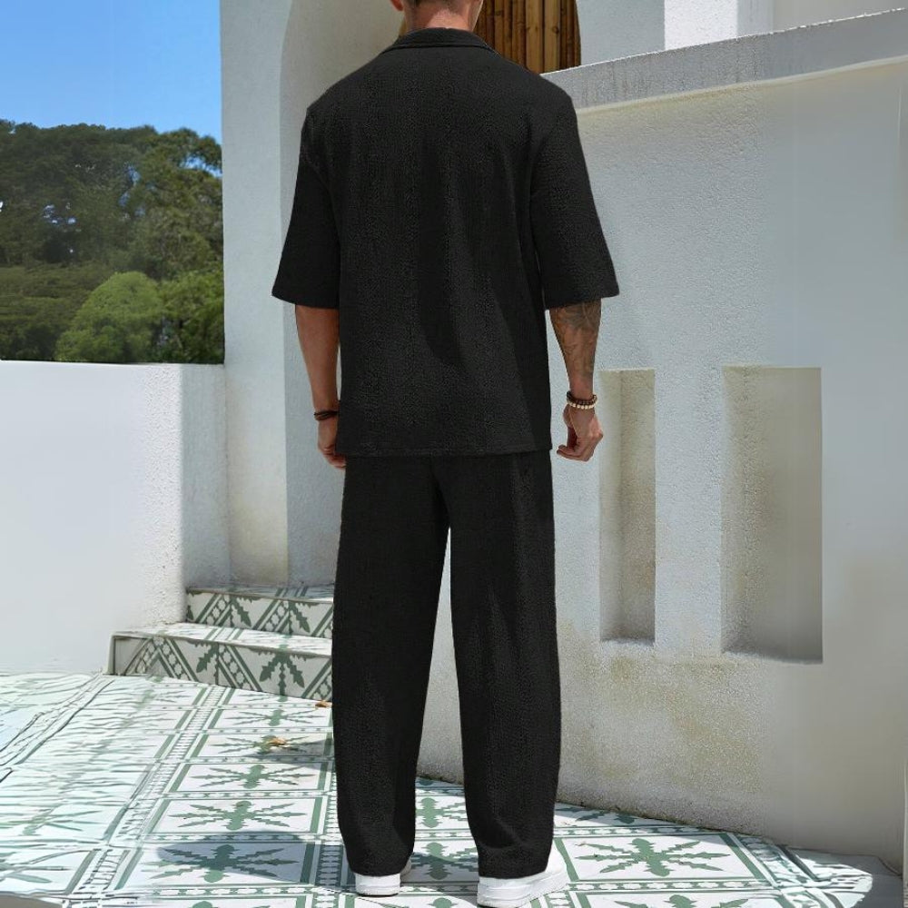 This Aule Texture Half Sleeve Set features half sleeve length for easy movement and breathability. Stay cool and comfortable while making a statement with a unique texture design. Perfect for those who want to add a touch of fun to their wardrobe.
